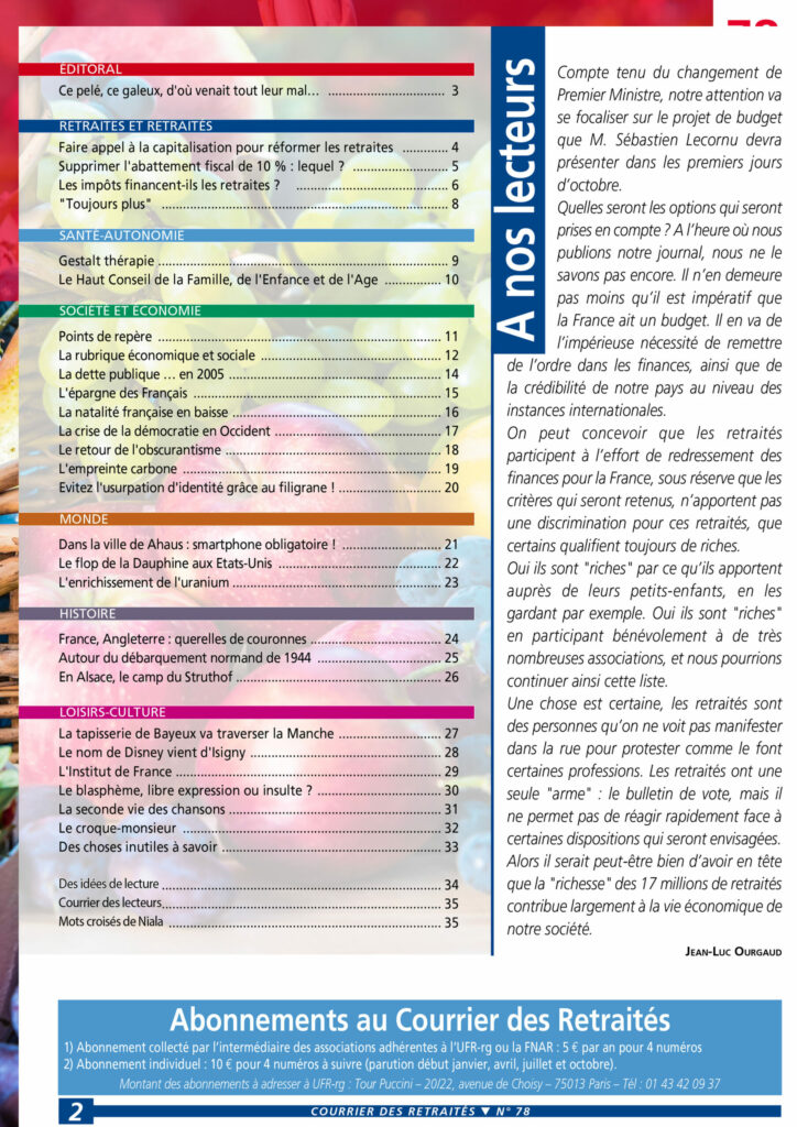Le Courrier des Retraités est une revue trimestrielle éditée par l’Union Française des Retraités-rg. Comme la fédération qui la patronne, cette revue est sans attache politique, syndicale, religieuse ou autre. Elle s’inscrit dans les politiques définies par l’UFR-rg, sa fédération et défend les intérêts des retraités et personnes âgées et c’est assurément un support utile pour les préretraités et futurs retraités.